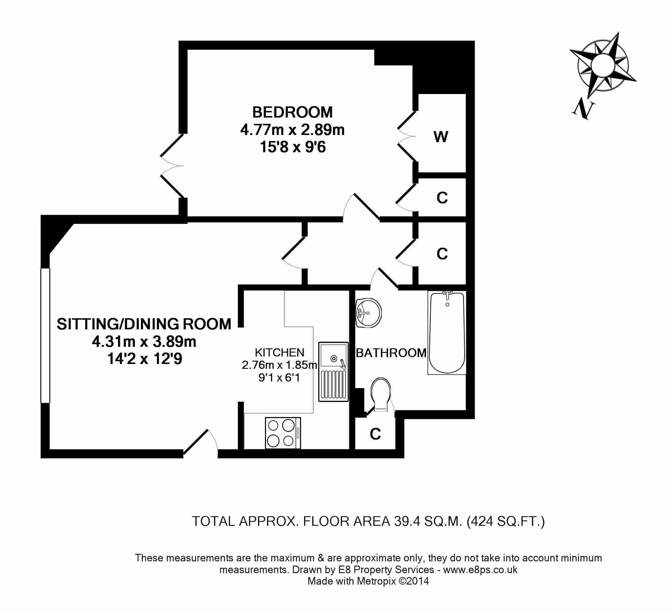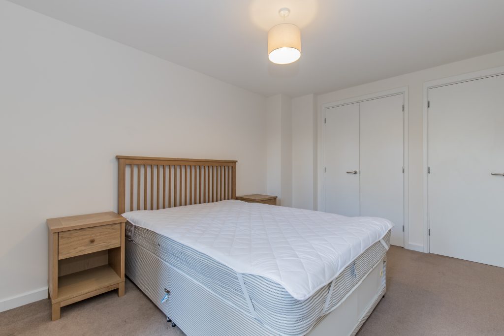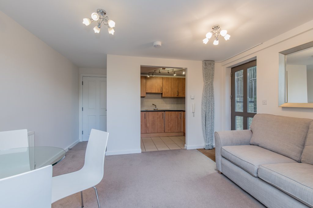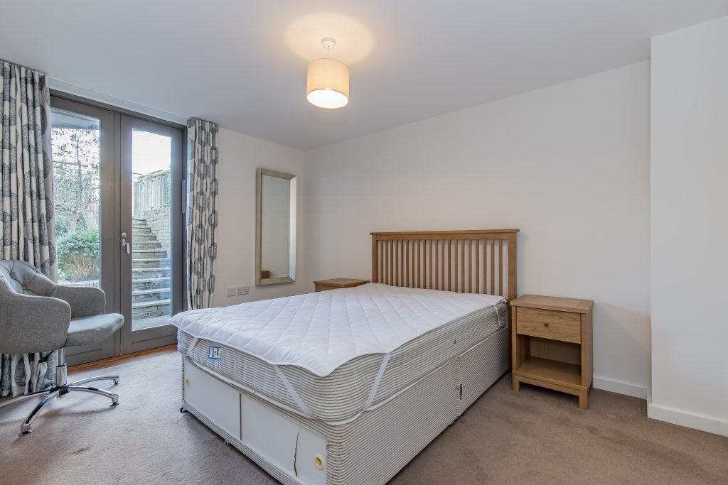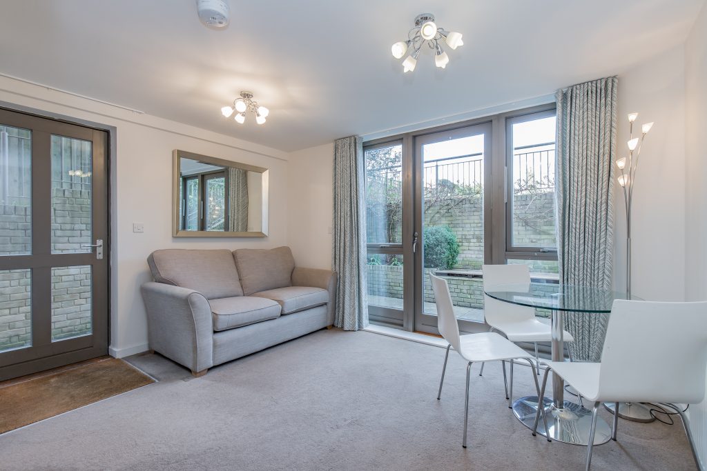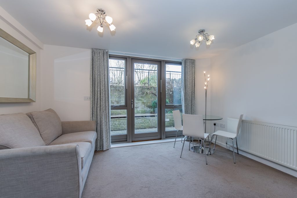 The apartment has an open-plan kitchen/sitting room with double doors leading out to a courtyard garden, a double bedroom with built-in wardrobes, and a separate bathroom with a shower over the bath. The apartment also has access to a large shared communal garden, and tenants can apply for a resident's on-street parking permit.