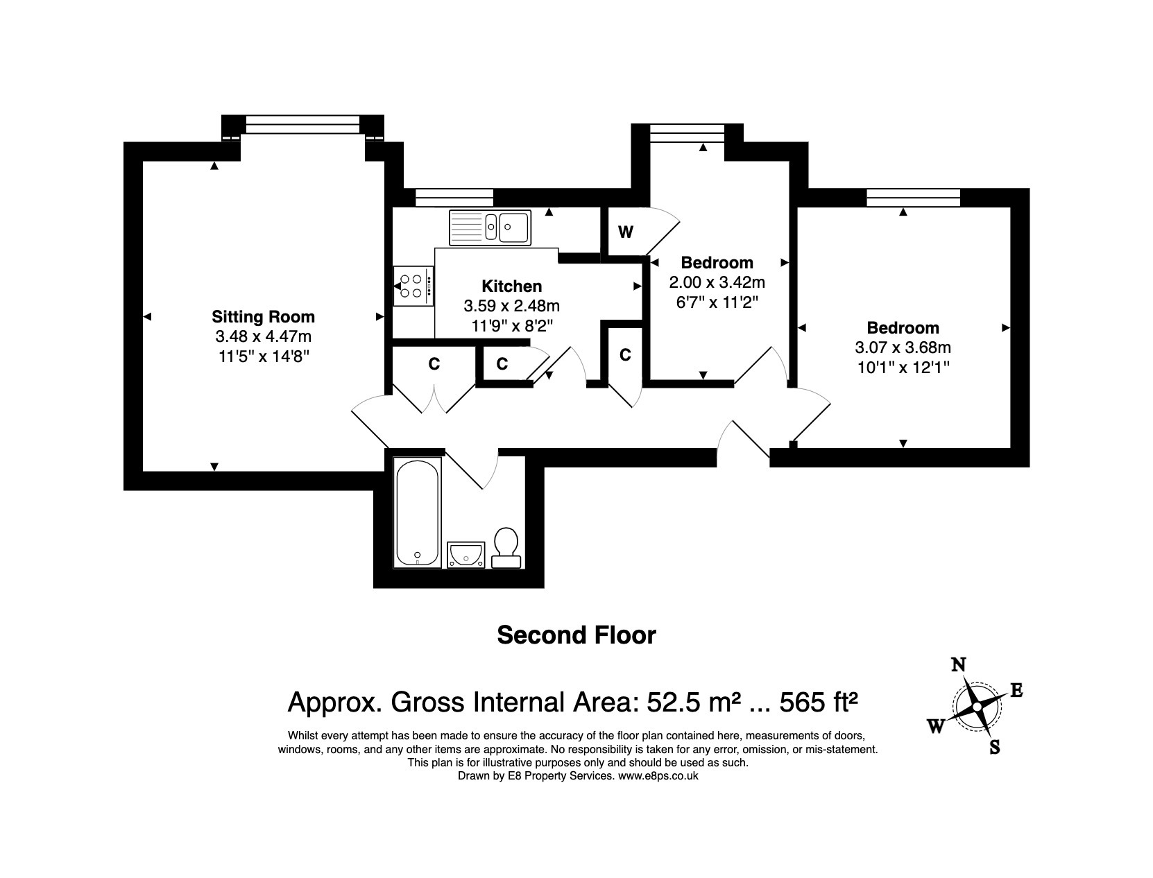 The apartment has a spacious living/dining room, a separate kitchen, two double bedrooms and a bathroom with shower over the bath.